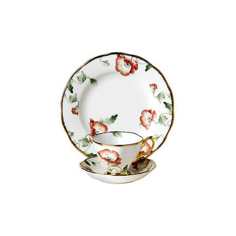 Оформленный в стиле английского дизайна, необыкновенной красоты шикарный набор посуды, состоящий из тарелки, блюдца и чашки, из тонкого фарфора. Каждый предмет украшает изящный рисунок прекрасных маков и эффектный золотой ободок. Такой набор станет не только украшением сервировки любого стола, но и отличным дополнением вашего интерьера. Если вы цените красивую и качественную посуду, то вам необходимо купить фарфоровый набор для своего дома! Количество предметов: 3 (чашка, блюдце и тарелка 20 см). Материал: фарфор. Производитель: Royal Albert, Англия.